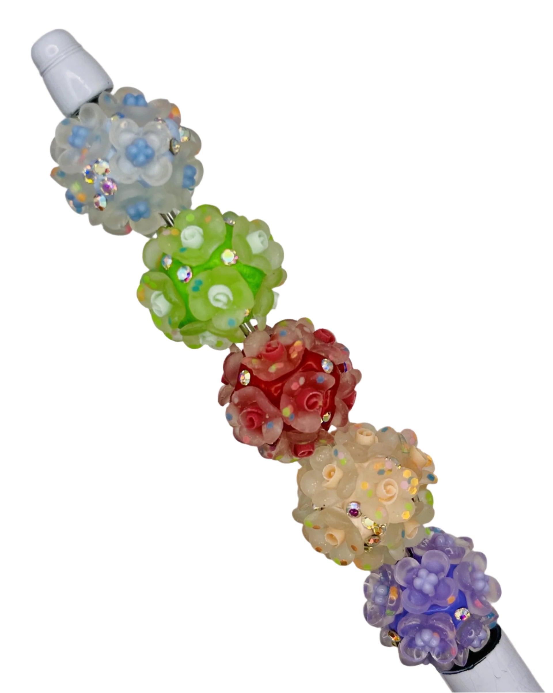 These 20mm handcrafted clay beads feature clusters of delicate roses and florals, finished with shimmering rhinestone accents. Each bead bursts with pastel charm and sparkle—perfect for pen beading, keychains, or whimsical jewelry pieces. A soft matte texture gives them a dreamy, handcrafted feel.