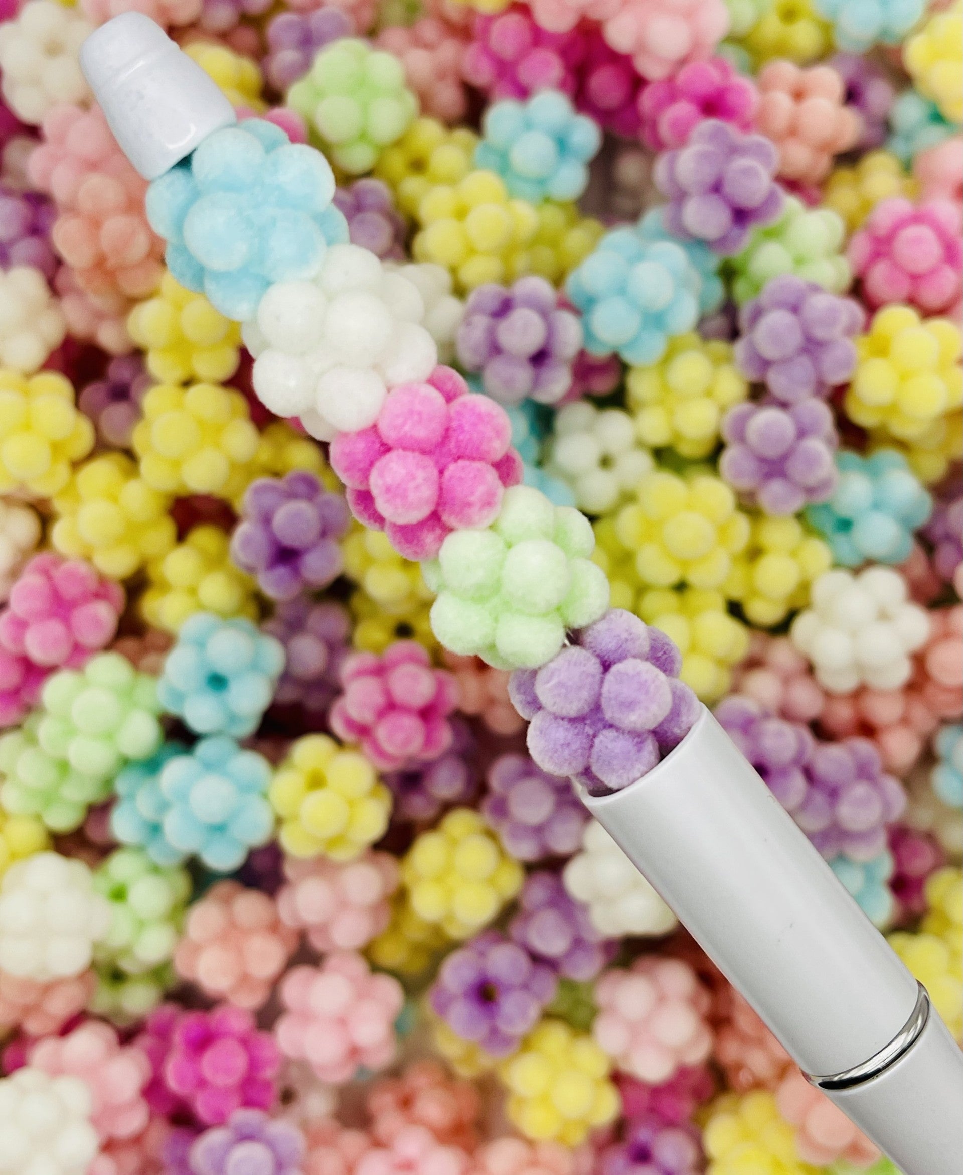 These flocked popcorn flower beads are as sweet as they look! With a fuzzy, velvety finish and soft pastel colors, each bead is shaped like a cluster of tiny flowers. Perfect for spring-inspired projects, they add a cute and cozy touch to pens, bracelets, and other beadable crafts.