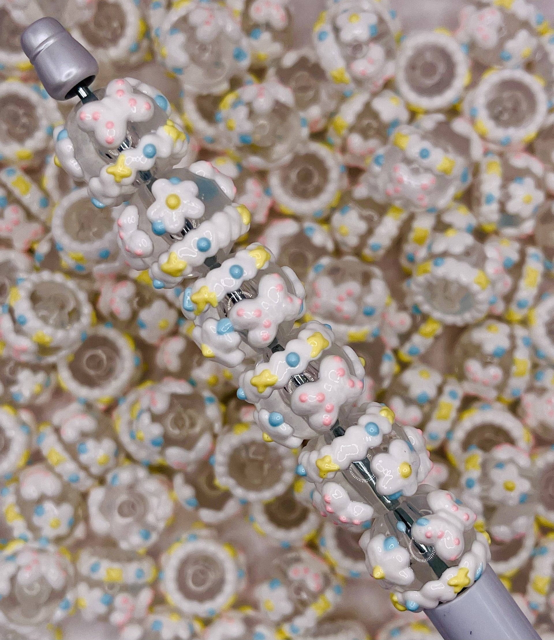 Sweet garden vibes! These hand-painted acrylic beads feature raised icing-style details with tiny flowers and butterflies in soft pastels on a white base. Chunky yet lightweight, the large-hole design slides smoothly on beadable pens and most beadable items, and stacks beautifully with rhinestone or bubble spacers.