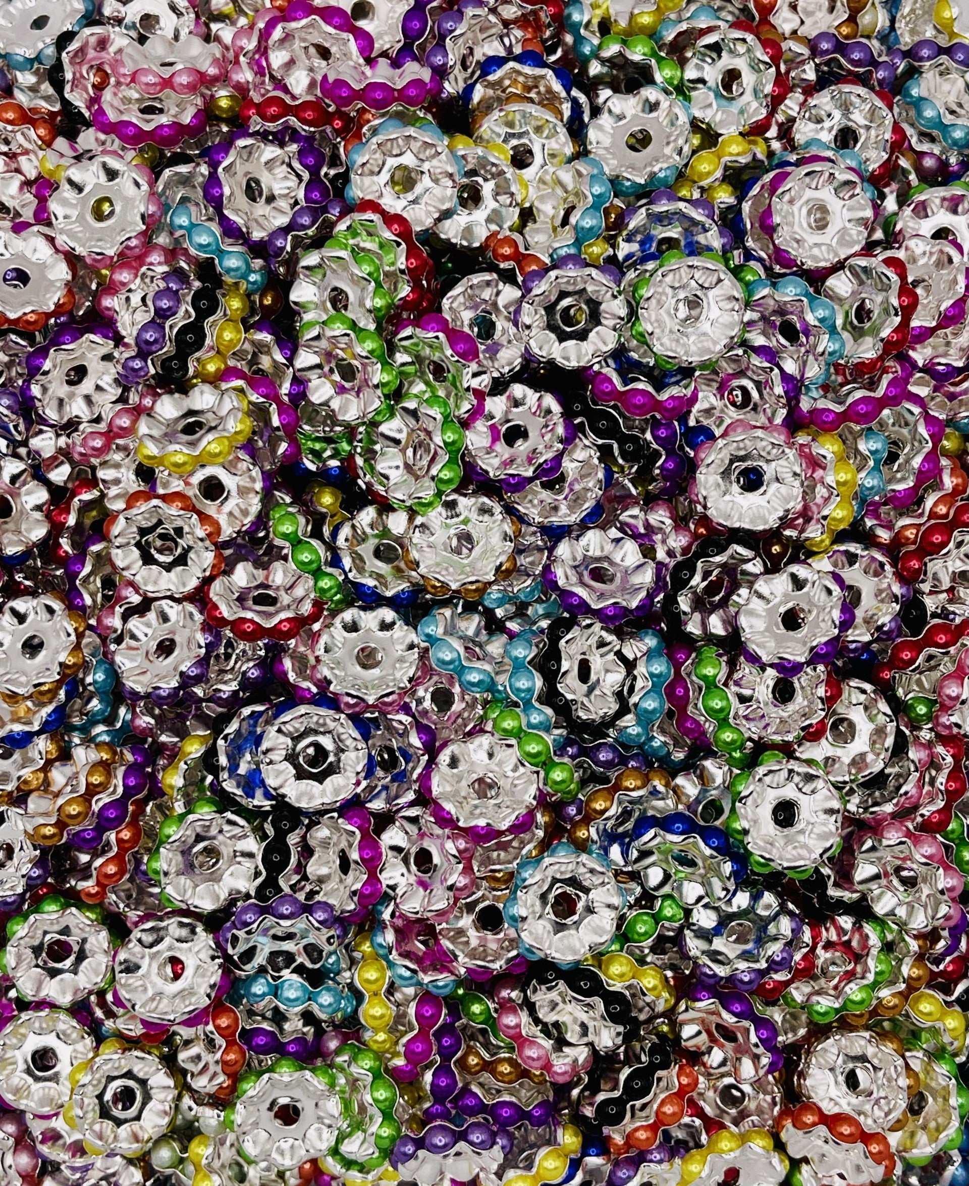 Add a splash of color and shine with these Multi-Color Pearl Edge Spacer Beads! Featuring a textured silver metal center and scalloped edges lined with colorful faux pearl beading, these 12mm disc spacers are perfect for separating focal beads or adding flair to any DIY design. Great for bracelets, earrings, pens, and more!