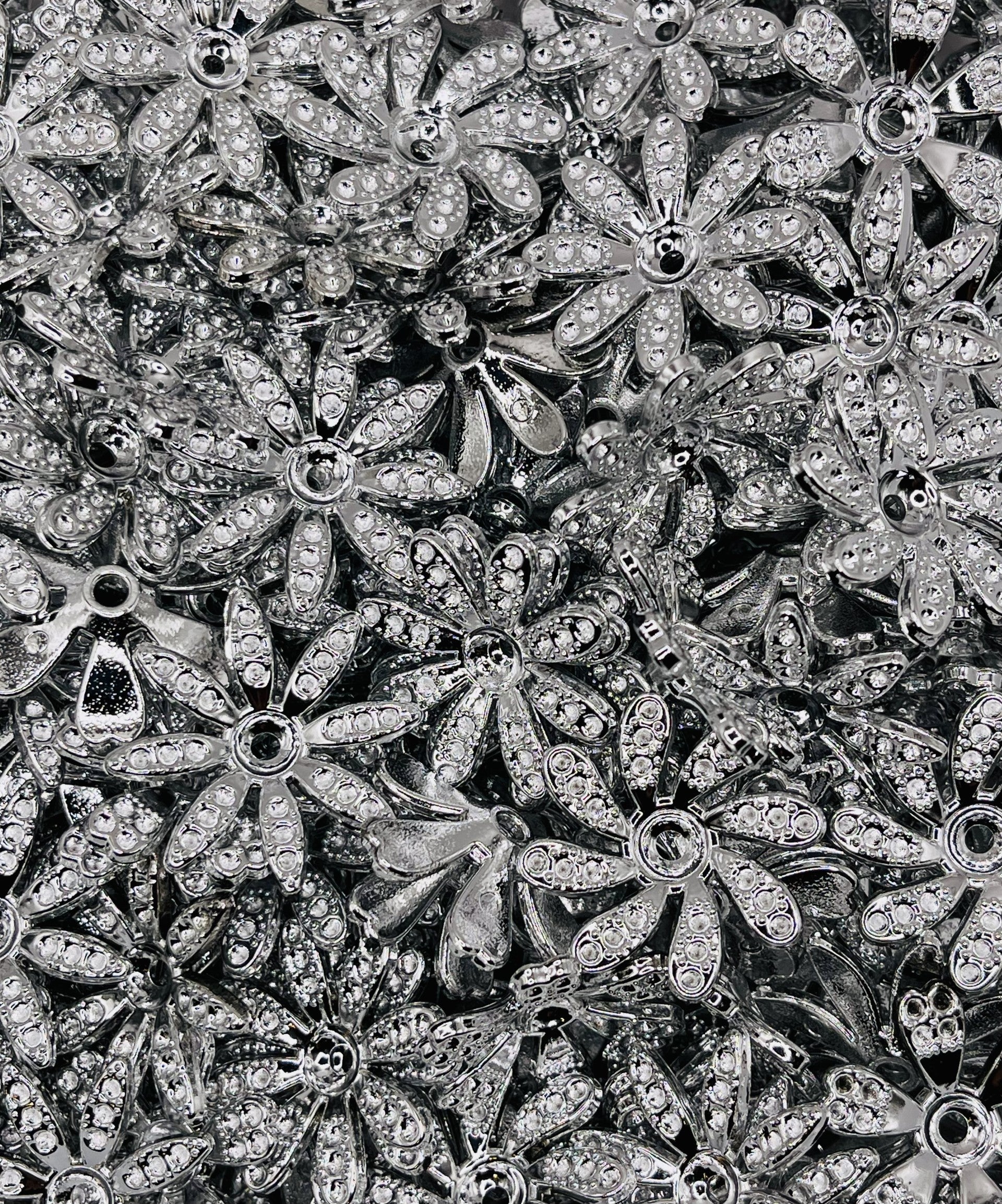 Add shimmer and elegance to your designs with these silver rhinestone flower spacer beads! Each bead features a dazzling floral shape with petal-like rhinestone details and a polished silver finish. Perfect for glam projects like pens, keychains, and bracelets that need a sparkling centerpiece.