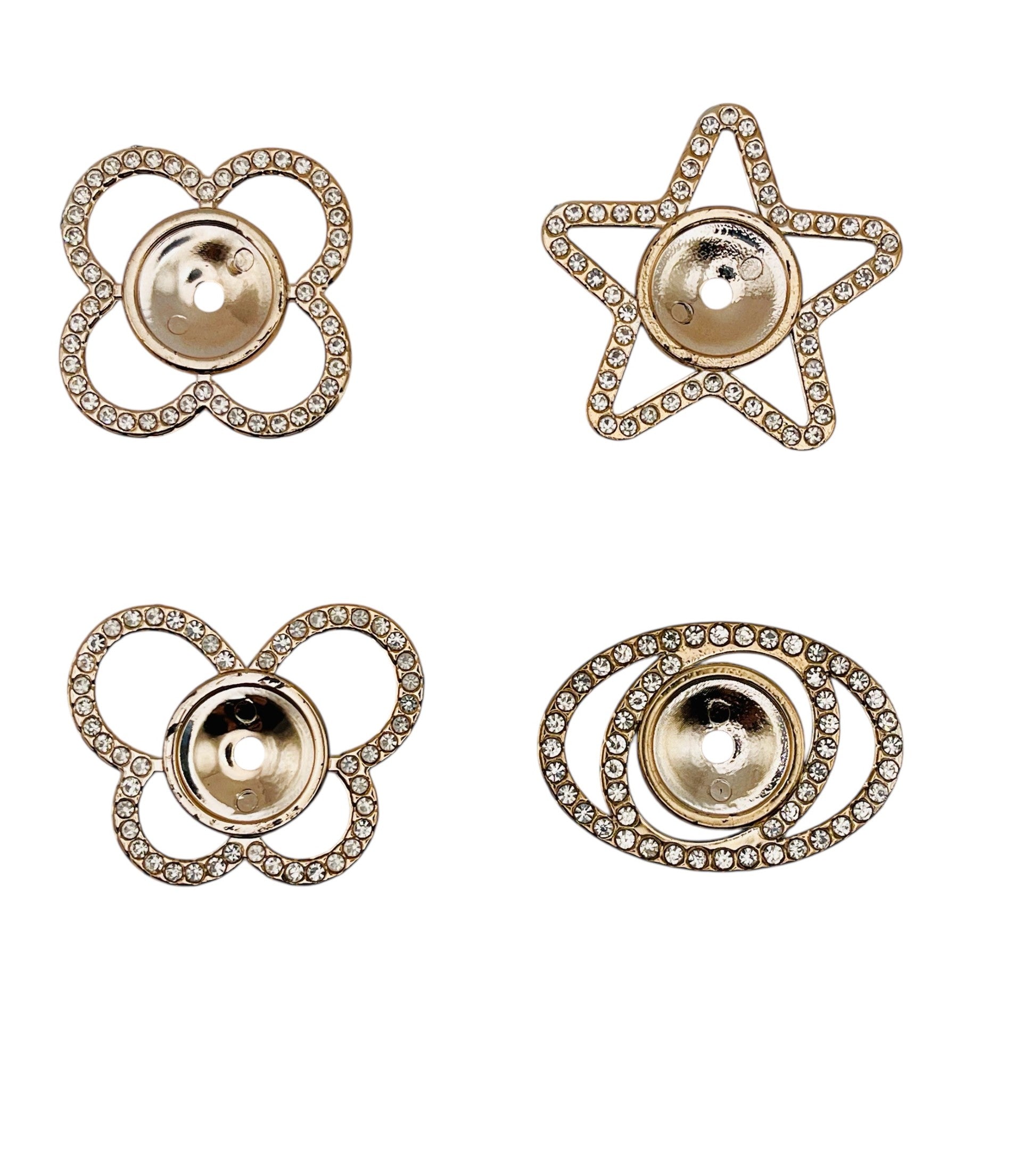 Add a dazzling touch to your crafts with this glamorous set of rhinestone spacers! Featuring four unique shapes — a flower, star, clover, and eye — each piece is outlined with sparkling rhinestones and includes a center hole that fits on pens and most beadable items. Perfect for keychains, bracelets, and statement DIY projects that deserve a little extra shine.